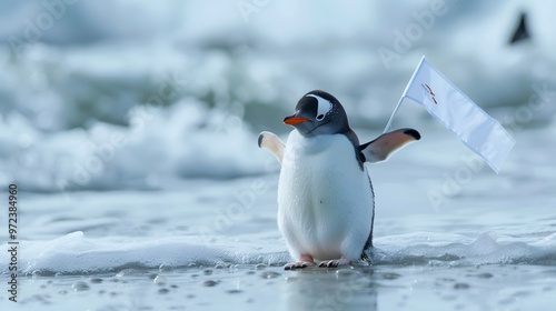 Obraz premium Penguin Holding White Flag: A cute penguin standing on ice, holding a small...