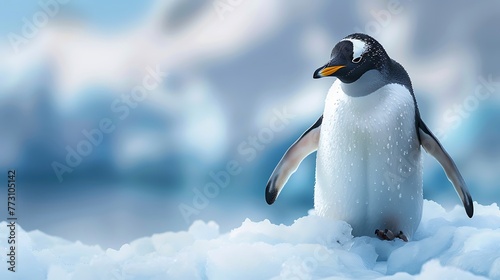 © Pandora arts, Fototapeta premium penguin in an iceberg pointing its flipper wing on blue background with copy space AI generated