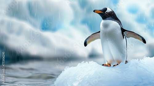 © Pandora arts, Fototapeta premium penguin in an iceberg pointing its flipper wing on blue background with copy space AI generated