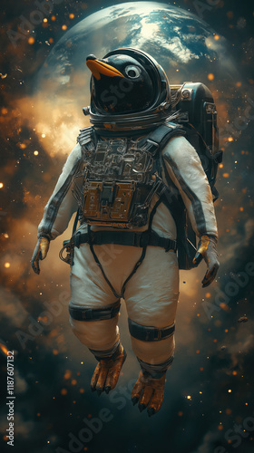 Fototapeta premium Penguin in Futuristic Spacesuit Floating in Space with Earth in the Background