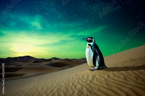Fototapeta premium penguin in the sahara desert with northern lights