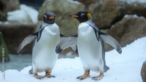 © MACHATOMI, Obraz premium Penguin pair dancing together on white, one bowing while the other twirls, their webbed feet leaving slight moisture marks on the surface