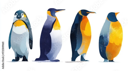 Fototapeta premium Penguin Parade: A charming array of watercolor-style penguins of varying species, exuding personality with each unique pose and color palette.