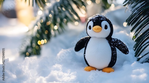 © James, Fototapeta premium Penguin plush standing by snowy Christmas coconut tree