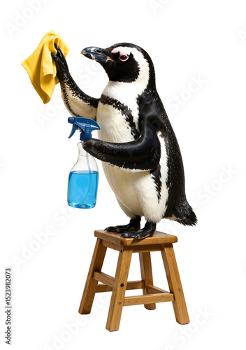 © Natural PNG, Obraz premium Penguin's Cleaning: A delightful penguin meticulously cleans, employing a spray bottle and cloth with a determined focus, perched atop a wooden stool. Capturing a whimsical scene.