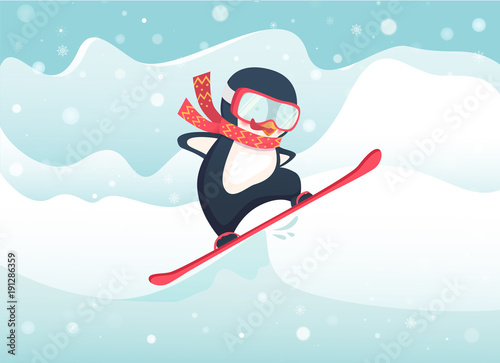 © Visual Content, Obraz premium penguin snowboarder at jump