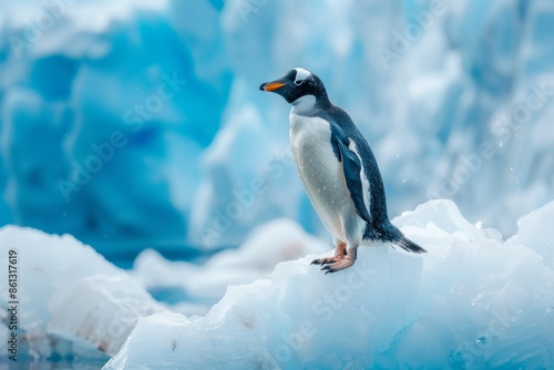 Naklejka premium Penguin standing on a beautiful blue iceberg.