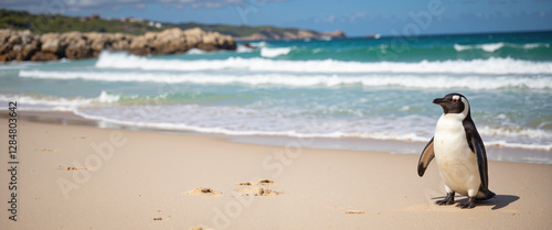 Fototapeta premium Penguin standing on sandy beach with waves crashing nearby conveying a sense of tranquility and freedom in a bright, sunny environment