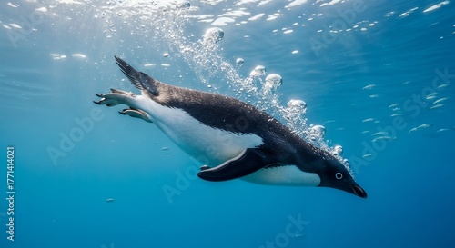 Fototapeta premium Penguin swimming underwater with bubbles and light filtering through water
