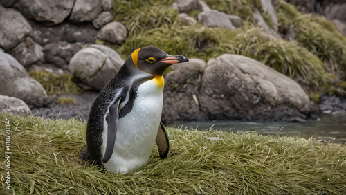 © Ozgurluk Design, Fototapeta premium penguin that is sitting on the grass by the water,