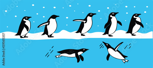 Naklejka premium Penguin Vector Collection – Stylized Emperor Penguins Walking, Swimming, and Grouped in Arctic Wildlife Scene.