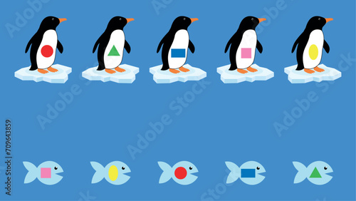 © Volodymyr, Obraz premium Penguins and fish on ice floes. Vector illustration.