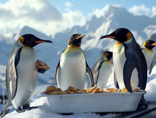 © Image Tree, Fototapeta premium Penguins enjoying a snow snack, sharing a tray of treats in a winter landscape with a mountain backdrop under a clear sky.