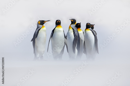 © ondrejprosicky, Naklejka premium Penguins in the snow. Group of King penguins coming to sea beach with wave a blue sky. Birds on the beach. Funny penguins image. Wildlife nature scene from Antarctica. Penguins with ocean.