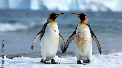 © Ifrah, Fototapeta premium Penguins interact playfully along a snowy coast with icy formations in the backdrop under a clear sky