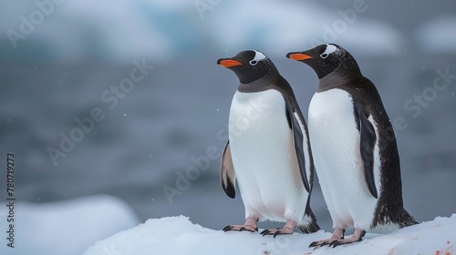 © Samon, Fototapeta premium Penguins on a melting icecap discussing relocation plans, chilly summit isolate on soft color background