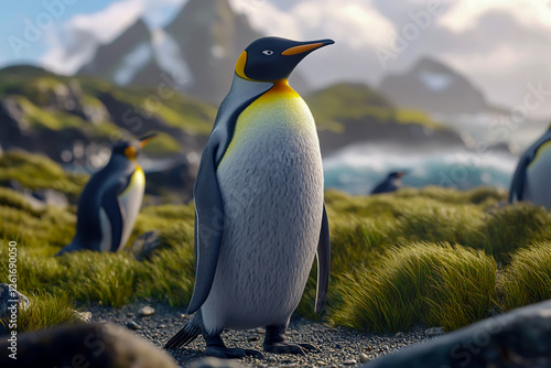 © MDOMAR, Fototapeta premium Penguins on an island surrounded by grass, rocks and sea.