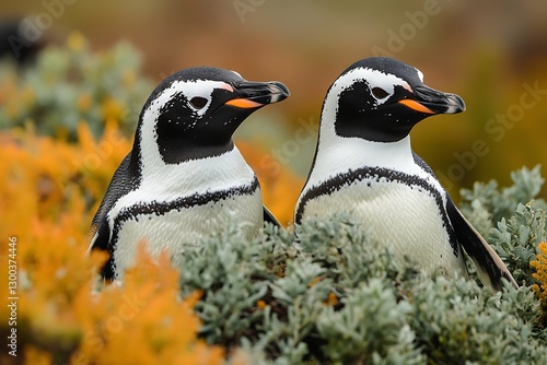 © Setu, Naklejka premium Penguins Pair Perched in Coastal Foliage, Nature Scene