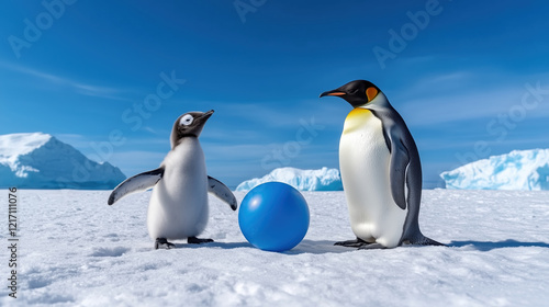 © Vasiliy, Obraz premium Penguins playing with blue ball on snow. Wildlife and winter content