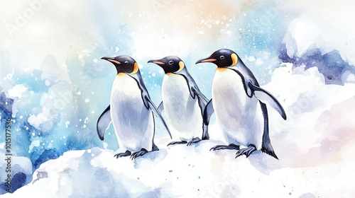 © Taisiia, Fototapeta premium Penguins she winter background watercolor