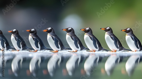 © Nit Nitchalernxai, Obraz premium Penguins Sliding in a Line on Ice