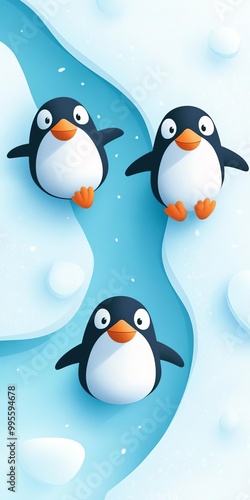 © SteadFast, Fototapeta premium Penguins sliding on ice flat design, top view, arctic landscape theme, water color, Triadic Color Scheme