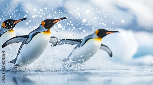 © Igor, Fototapeta premium Penguins splash in water, heads above surface