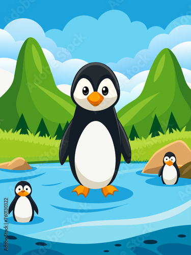 Naklejka premium Penguins stand on the shore of a calm, clear lake against a backdrop of...