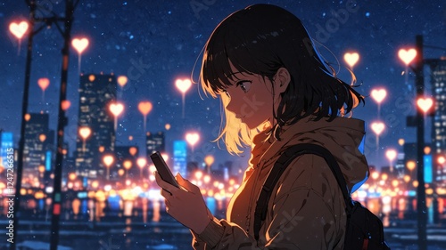 Fototapeta premium Pensive anime girl in city with heart lights gazes at phone, creating a...