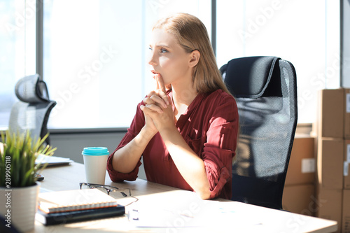 Obraz premium Pensive business woman is keeping hands clasped while sitting in modern office