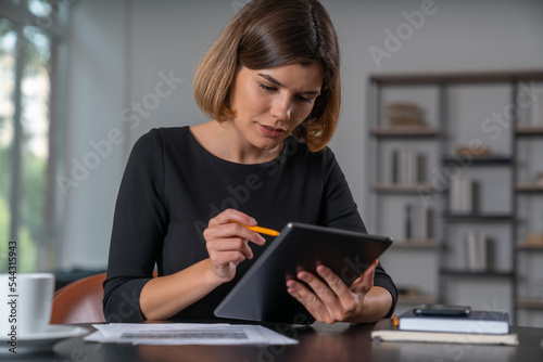 © VideoFlow, Fototapeta premium Pensive businesswoman in formal wear working with tablet holding pen