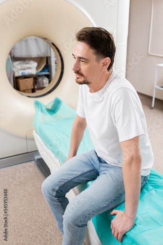 Obraz premium pensive man looking away while sitting near computed tomography machine in...