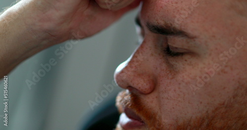 © Marco, Fototapeta premium Pensive man looking for solution to problem, redhair guy seeking help of God looking up