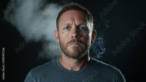 © nunne, Fototapeta premium Pensive man with a serious expression, smoke in the background, studio portrait.