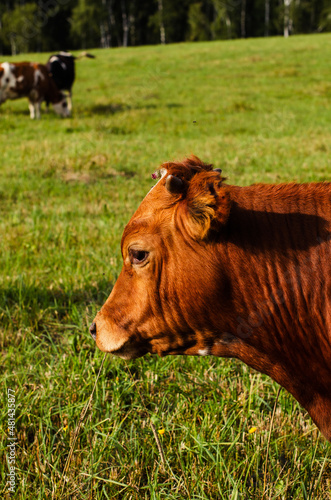 © Ксения Кечайкина, Fototapeta premium pensive red calf side view against the background of green pasture