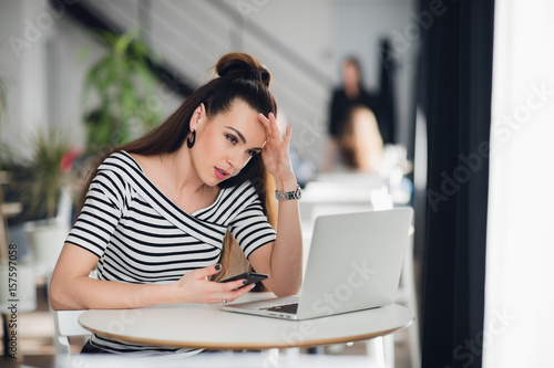 © romankosolapov, Fototapeta premium Pensive talented attractive female journalist is thinking over creative solutions for making article working in cafe, charming skilled designer noting ideas for start up in her smartphone.