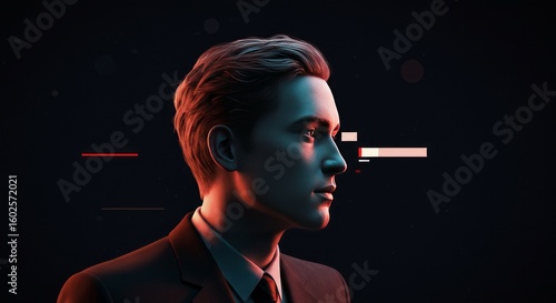© jenangkatul, Obraz premium Pensive Young Man in Dark Suit Profile Futuristic Background