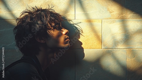 Fototapeta premium Pensive young man's profile, sunlight shadow on wall.