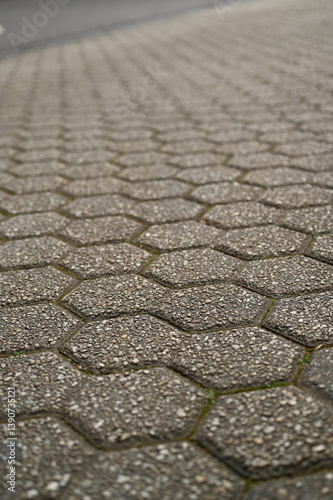 Obraz premium pentagonal grey paving tile texture, grey tile pattern as background, grey tile texture close up tiles as a background in the old town, grey tiles