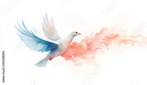 © Bargais, Obraz premium Pentecost background with flying dove. Watercolor painting.