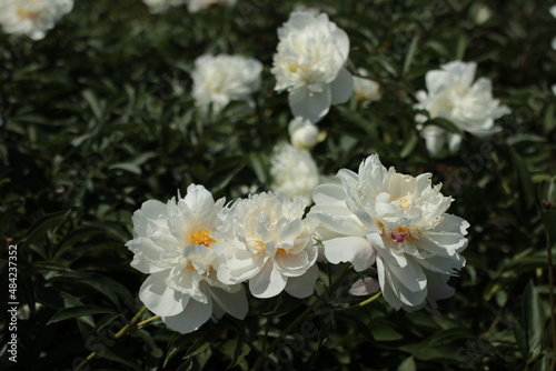 © Tatsiana Belarus, Obraz premium Peonies. Three white flowers in the foreground. Garden plant