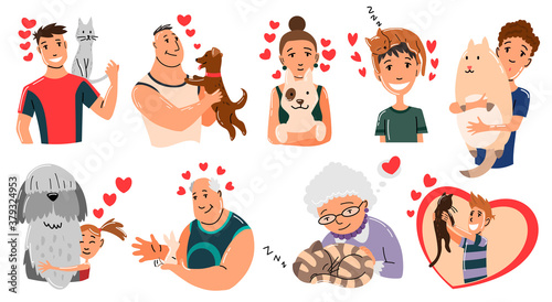 Fototapeta premium People and pets. Cat, dog and rabbit pet owner characters. Man and womans holding on hands his animals. Peoples love his animals. Cute and adorable domestic animals