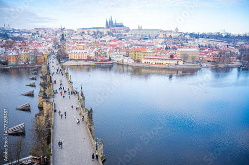 Fototapeta premium People are walking on Charles bridge, whose rooftops are covered by snow,...