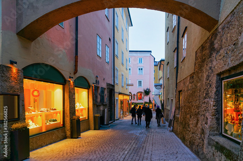 © Roman Babakin, Fototapeta premium People at Narrow Street with shops and stores at Old city of Salzburg, Austria. Building architecture of Mozart town, Europe, winter. Panorama and landmark. Cityscape in Evening. Travel and tourism.