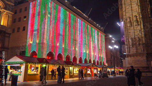 Obraz premium People buy gifts at the festive Christmas market in the city center Albero di Natale Christmas tree with colorful lights. City at night. One night ahead. Multicolored lights. Milan Italy December 2022