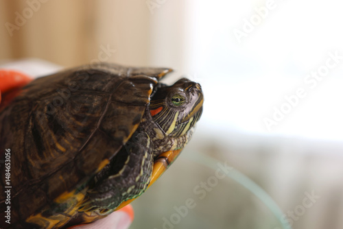 © Vasyl, Obraz premium People care for and play with a pet red-eared turtle.