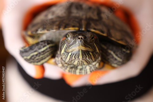© Vasyl, Obraz premium People care for and play with a pet red-eared turtle.