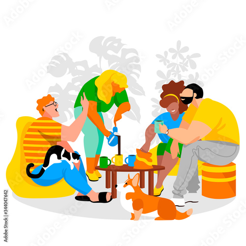 © Olga Tik, Naklejka premium people communicate. friends. people are celebrating. tableful. vector image of people and Pets. family