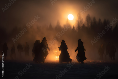 Obraz premium People dancing around pagan fire ritual during the winter solstice...