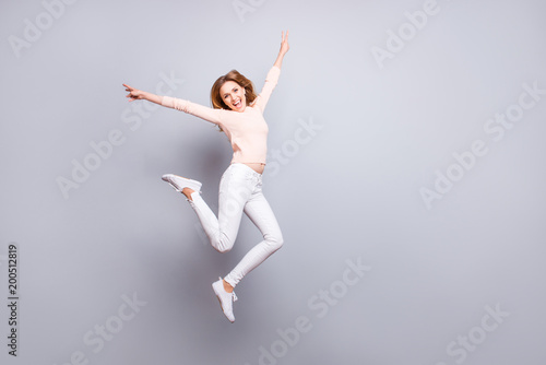 © deagreez, Fototapeta premium People emotion expressing feeling good mood person concept. Full-size portrait of excited cheerful joyful rejoicing delightful pretty woman jumping up showing v-sign isolated on gray background